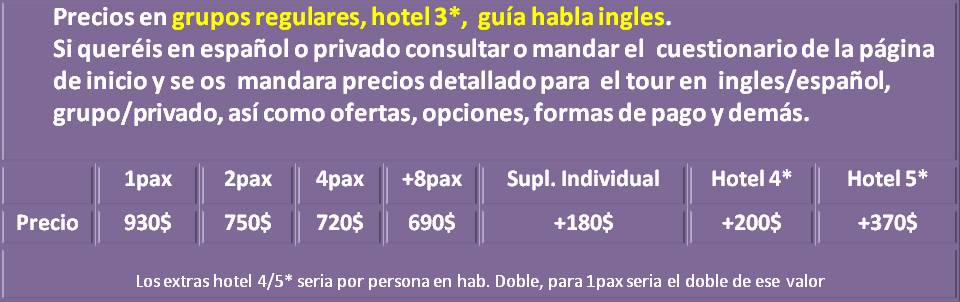 - Todos los tours existentes puedes modificarlos para adáptalos a lo que te venga mejor en días, calidades, visitas, combinaciones y extenderlos con cualquier actividad, tour u otros países.