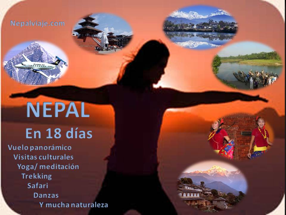 Con este programa, primero veras las maravillas de la cultura nepalí, con sus danzas, ciudades medievales, templos y lugares sagrados. También veras otra de sus maravillas: el Everest desde un avión panorámico donde lo veras muy de cerca. Y seguiremos con 3 días intensos en la selva de Chitwan, con sus mágicas puestas de sol, cocodrilos, dinosaurios, tigres, elefantes, entre otros muchos animales, donde te relajaras con su inmensa paz natural, para a continuación hacer un trekking de 5 días, una media de 5 horas diarias de caminata entra magníficos bosques, montañas y paisajes de postal, para una vez practicado el deporte, entrar en otra aventura inmensa… el viaje hacia nuestro interior, con la meditación, yoga, y practicas budistas que te llevaran a descubrir todo esa paz y potencial interno que llevamos dentro, despertando de forma natural ese amor por la vida en todas sus expresiones.