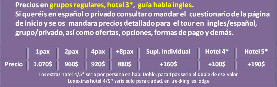Comidas incluidas: desayuno en ciudad. Todas en trekking. Cena-danza de bienvenida