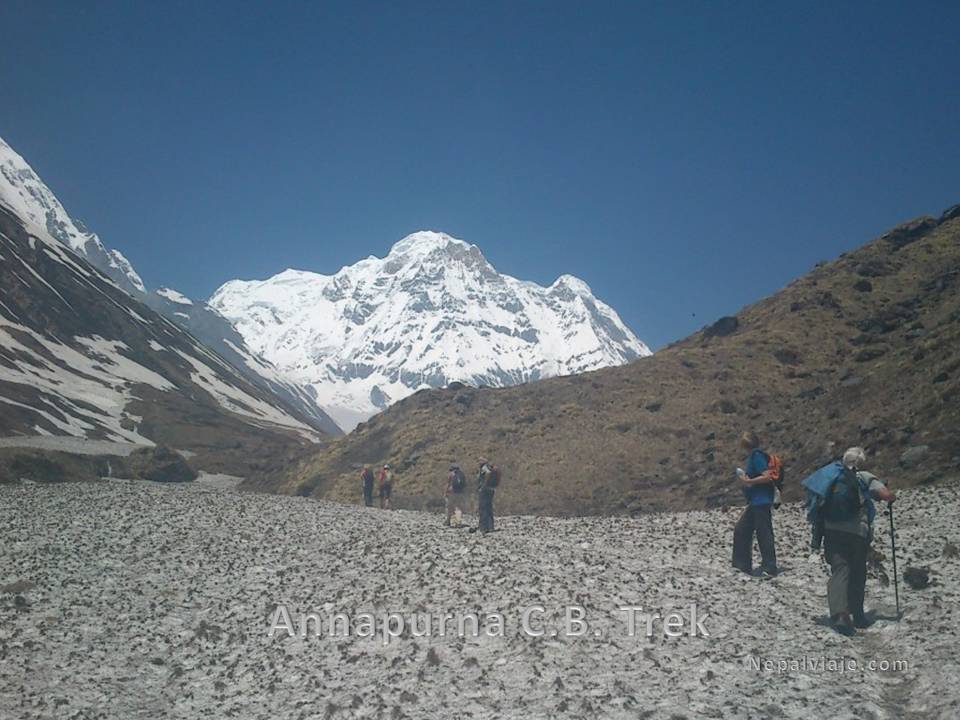 Temprano hacemos 2 horas de caminata al campamento base del Annapurna, cruzando cuatro hoteles en una loma a (4.130m). El camino continúa hacia arriba, hasta llegar a un algo donde es el punto culminante del viaje y nos brinda unas maravillosas vistas de cerca de las montañas que componen este increíble anfiteatro natura, tenemos una magnífica vista de la cara sur del Annapurna casi vertical que se eleva por encima del Santuario hacia el norte-oeste, que fue escalado en 1970 por Don Whillans y Dougal Haston en una expedición dirigida por Chris Bonington. Llegamos al campo base a media mañana, lo que permite suficiente tiempo para explorar los alrededores y tomar algunas fotografías impresionantes. Noche en el campo base