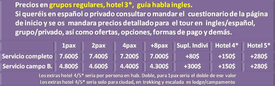Comidas incluidas: desayuno en ciudad. Todas en trekking. Cena-danza de bienvenida